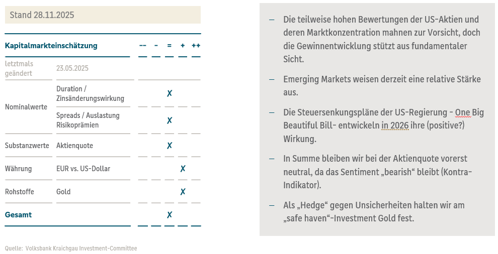 Disclaimer: Dieses Dokument wurde durch die Volksbank Kraichgau eG erstellt. Es dient ausschließlich lnformationszwecken und stellt weder ein öffentliches Angebot noch eine Aufforderung zur Abgabe eines Angebots zum Erwerb von Wertpapieren oder Finanzinstrumenten dar. Dieses Dokument ist keine Finanzanalyse. Alle hierin enthaltenen Bewertungen, Stellungnahmen oder Erklärungen sind diejenigen des Verfassers des Dokuments und stimmen nicht notwendigerweise mit denen dritter Parteien überein. Die Volksbank Kraichgau eG übernimmt keine Haftung für unmittelbare oder mittelbare Schäden, die durch die Verteilung und/oder Verwendung dieses Dokuments verursacht werden und/oder mit der Verteilung und/oder Verwendung dieses Dokuments im Zusammenhang stehen. Eine Investitionsentscheidung bezüglich irgendwelcher Wertpapiere oder sonstiger Finanzinstrumente sollte auf der Grundlage eines Beratungsgesprächs sowie Prospekts oder Informationsmemorandums erfolgen und auf keinen Fall auf der Grundlage dieses Dokuments. Die Inhalte dieses Dokuments entsprechen dem Stand zum Zeitpunkt der Erstellung des Dokuments. Sie können aufgrund künftiger Entwicklungen überholt sein, ohne dass das Dokument geändert wurde.