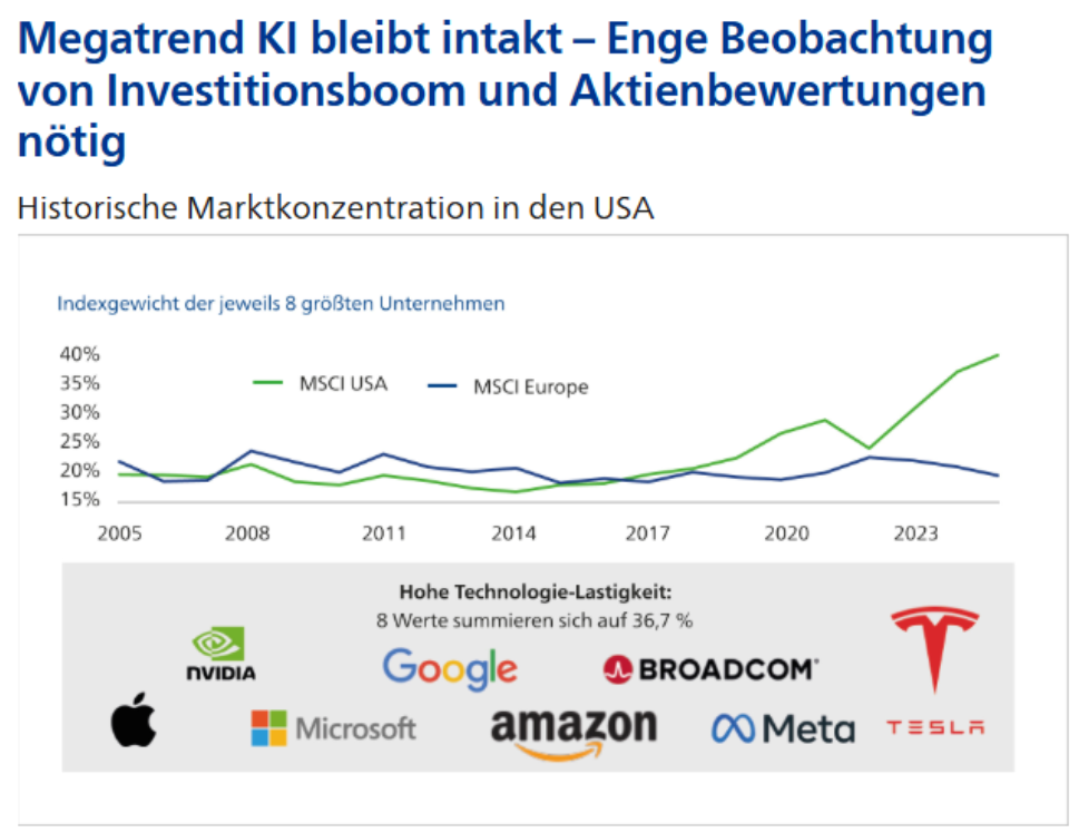 Der November 2025 war ein schwacher Aktienmonat und stellte die Nerven der Investorengemeinde nach längerer Zeit mal wieder auf die Probe. Das gefühlt „tausend Mal“ genannte Wort war „KI-Blase“. Hier an dieser Stelle, in welcher wir über unsere aktuelle Markteinschätzung und Positionierung in der Vermögensverwaltung sowie in den Beratungen im Rahmen des Investment Consulting berichten, möchten wir darauf nicht eingehen. Warum? Nun, aus unserer Sicht ist hier bereits sehr viel an Informationen in Umlauf gebracht worden. Sei es die angeblichen Luftbuchungen bei NVIDIA, oder die fragwürdigen gegenseitigen Beteiligungen einiger KI-Unternehmen untereinander. Nein, wir konzentrieren uns auf die Fakten, und diese lauten: