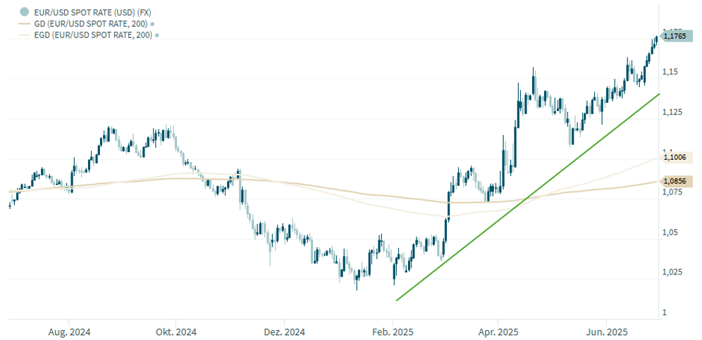 Diese vorsichtige Haltung gaben wir Ende April bzw. Anfang Mai grundsätzlich auf und erhöhten die Aktienquoten in jeder Anlagestrategie wieder auf das neutrale Gewicht – und manchmal sogar darüber hinaus. Dies hat sich zwar einerseits deutlich in einer Erholung der Performance bemerkbar gemacht, andererseits hatten wir einen großen Gegner, welcher höhere Erträge verhinderte: den US-Dollar. Denn dieser hat einen eindeutigen Trend eingeschlagen, wie der nachfolgende Chart EUR/USD im Zeitraum letzte 12 Monate eindrucksvoll zeigt: