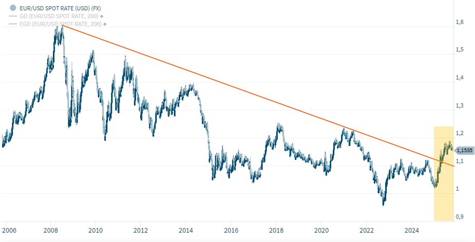 In der Grafik sehen Sie die Entwicklung einzelner passiver Indexfonds (ETF´s) auf bekannte Marktindizes. Der massive Einbruch im April nach der Ankündigung der neuen Handelszölle ist deutlich zu sehen, die darauf folgende Erholung ist beeindrucken. Alle hier betrachteten Index-ETF´s liegen zweistellig im positiven Bereich. Dabei liegen in Währung betrachtet die „großen“ Produkte gleichauf, lediglich Japan und Emerging Markets können sich von der großen Herde etwas absetzen. Allerdings muss hier die Währungsentwicklung berücksichtigt werden, denn nach wie vor gilt: Der EUR konnte gegenüber dem USD mit über 11% kräftig zulegen und dies schmälert in Form von Währungsverlusten die Investition eines EUR-Investors in USD-Anlagen. Um die Bedeutung dieser Thematik besser hervorzuheben haben wir Ihnen nachfolgend einen langfristigen EUR/USD-Chart beigefügt: