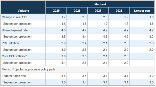 Und so stiegen die Kurse an den US-Aktienmärkten. Dies auch vor dem Hintergrund, dass die Fed den Kauf kurzlaufender Staatsanleihen im Wert von 40 Milliarden Dollar in den kommenden 30 Tagen angekündigt hat. Damit fließt neue Liquidität in die Märkte. Ziel dieser Maßnahme ist es, den Refinanzierungsmarkt zu entlasten, wo es zuletzt zu erhöhter Spannung gekommen war. Ebenfalls wichtig war die Anhebung der Wachstumsprognosen seitens der US-Notenbank. Im laufenden Jahr 2025 soll das Bruttoinlandsprodukt um 1,7 % zulegen (bisherige Prognose +1,6 %). Für das Jahr 2026 wird nun ein Wirtschaftswachstum von +2,3 % erwartet (bisherige Prognose +1,8 %). Gleichzeitig rechnet die Fed mit einer geringeren Inflation. Für 2025 wurde die Inflationsprognose leicht von +3,0 % auf +2,9 % gesenkt. Für das Jahr 2026 wird nun eine Inflationsrate von +2,4 % erwartet, verglichen mit der vorherigen Schätzung von +2,6 %.