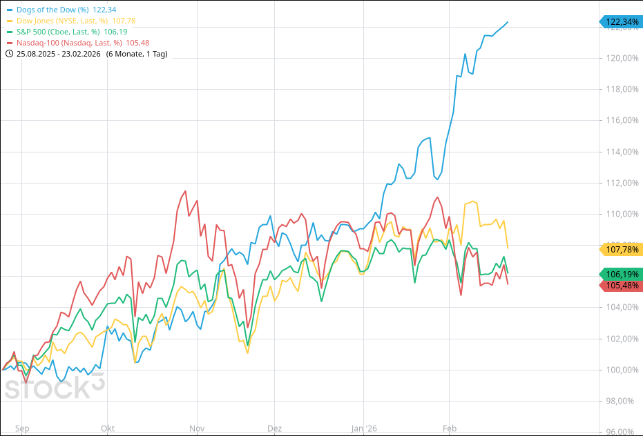 Wenn es eine Anlageregel gibt, die so simpel wie verlockend klingt, dann ist es diese: Kaufe die zehn Dow-Jones-Aktien mit der höchsten Dividendenrendite – und warte ein Jahr ab. Die „Dogs of the Dow“ nennt man diese Strategie, die auf der Annahme beruht, dass unterbewertete Blue Chips nach einer Schwächephase wieder aufholen. Die Zusammenstellung der 10 Titel erfolgt immer zu Jahresanfang. Und es gab einige Jahre, in denen weder die Performance noch die Nachfrage nach dieser Strategie von Interesse war. Doch dies hat sich geändert.