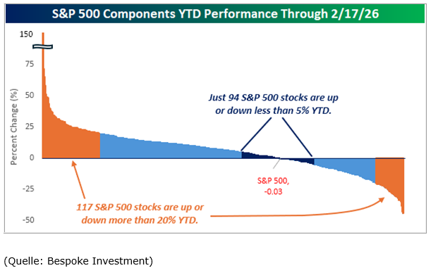 Wie die Bespoke Investment Group mit untenstehender Grafik berichtet, versucht der (US-)Markt aktuell, zwischen Gewinnern und Verlierern der Entwicklungen rund um das Thema Künstliche Intelligenz (KI) zu unterscheiden. Und dabei werden die möglichen Gewinner (weiterhin) gekauft, werden die vermeintlichen Verlierer (inzwischen) abgestraft und deren Aktienkurse nach unten geprügelt werden. Doch nicht nur das – das Geld fließt auch wieder in „langweilige“ Aktien wie z.B. Nahrungsmittel- Industrie- oder Ölaktien: