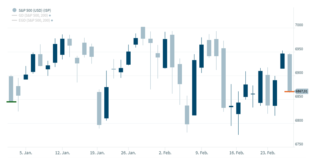 Unter dem Strich kommt der US-Aktienmarkt, gemessen am Standardindex S&P500, nicht vom Fleck. Hier der passende Chart, der grüne Strich zeigt den ersten Kurs am Jahresbeginn, der orangefarbene Strich den aktuellen Kurs. Differenz: nur wenige Punkte: