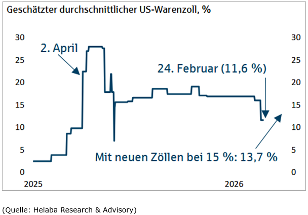 Und selbst das „Zoll-Chaos“ kann diese Situation im Moment nicht durchbrechen, weder positiv noch negativ. Man kann den Eindruck gewinnen, dass Aktienmarktakteure hier langsam etwas „abstumpfen“. Betrachtet man nur die Zölle an sich, so fallen diese nun global betrachtet etwas niedriger aus als zuvor. Mit dem Wegfall der rechtswidrigen („reziproken“) Zölle ging der Durchschnittszoll laut Schätzungen von rund 16% auf etwa 9% zurück, durch einen neuen globalen Warenzoll von 15% läge der aktuelle Durchschnittszoll bei geschätzt knapp 13,7%: