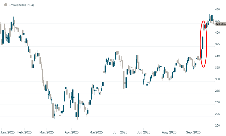 Tesla sorgte dieser Tage einmal mehr für Schlagzeilen durch Elon Musk. Er erwarb am Freitag vergangener Woche Tesla-Aktien im Wert von rund 1 Milliarde US-Dollar. Zur Einordnung: Musk gehört etwa ein Sechstel des Autobauers. Und diese Beteiligung ist rund 200 Milliarden Dollar wert. Der aktuelle Zukauf ist Musks erster seit 2020. Musk strebt eigentlich schon seit Jahren eine Beteiligung von 25 % an, um seine Position im und seinen Einfluss auf das Unternehmen zu stärken. Bei einem Börsenwert von insgesamt knapp 1,3 Billionen Dollar macht die aktuelle Transaktion aber weniger als 0,1 % aller Tesla-Aktien aus. An der Börse sorgte Musks Aktienkauf dennoch für deutliche Kursgewinne, die sich am Montag fortsetzten, als die Transaktion öffentlich (bekanntgemacht) wurde. Binnen nur 3 Handelstagen schoss der Aktienkurs in der Spitze um +22,47 % nach oben.