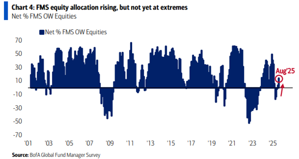 Die Fondsmanager sind für Aktien weiterhin optimistisch: Der Nettoanteil derjenigen, welche Aktien übergewichten, stieg um August um 10 Prozentpunkte auf nun 14 %. Es ist in diesem Kontext jedoch wichtig zu betonen, dass die Stimmung für Aktien im historischen Vergleich keineswegs überschwänglich ist, sondern eher solide im positiv-neutralen Bereich.