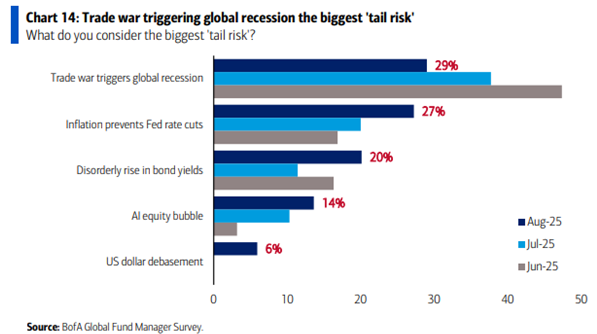 Allerdings sehen 27% der befragten Fondsmanager die Inflation als ernst zu nehmendes Problem und 20% haben Sorge vor massiv steigenden Renditen am US-Bondmarkt. Diese Themen stehen mit der aktuellen US-Regierung direkt in Verbindung, denn einerseits könnten die verhängten Zölle die Inflation nach oben treiben und dass der US-Präsident gerne – steigenden US-Staatsschulden zum Trotz – niedrigere Zinsen sehen möchte, ist inzwischen jedem Kapitalmarktakteur bis hin zur US-Notenbank klar.